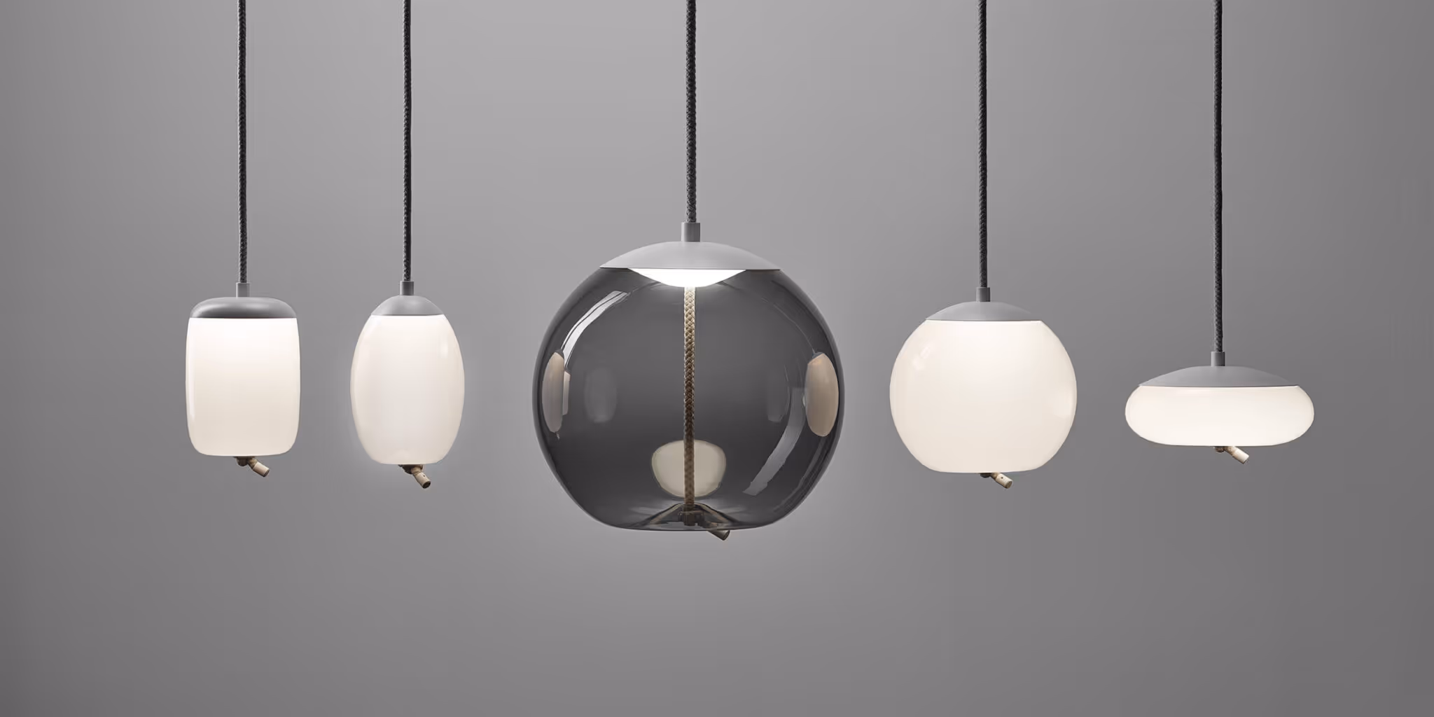 Knot, a collection of stately pendent lights, contrasts two dissimilar materials, two dissimilar notions: gentle curves in clear handblown glass against the austerity of coarse rope. The resulting design is striking, forthright, and dignified at the same time. Full-bodied globes of varying shapes and sizes are penetrated by robust rope ending in the core design element of the collection – the knot – which seemingly pulls the bottom of the glass inward for a bemusing plastic effect. The LED light source is mounted beneath an elegant hood made of stamped metal and protected from below by a handblown opal diffusor. Another metal component serves to cap the end of the rope.