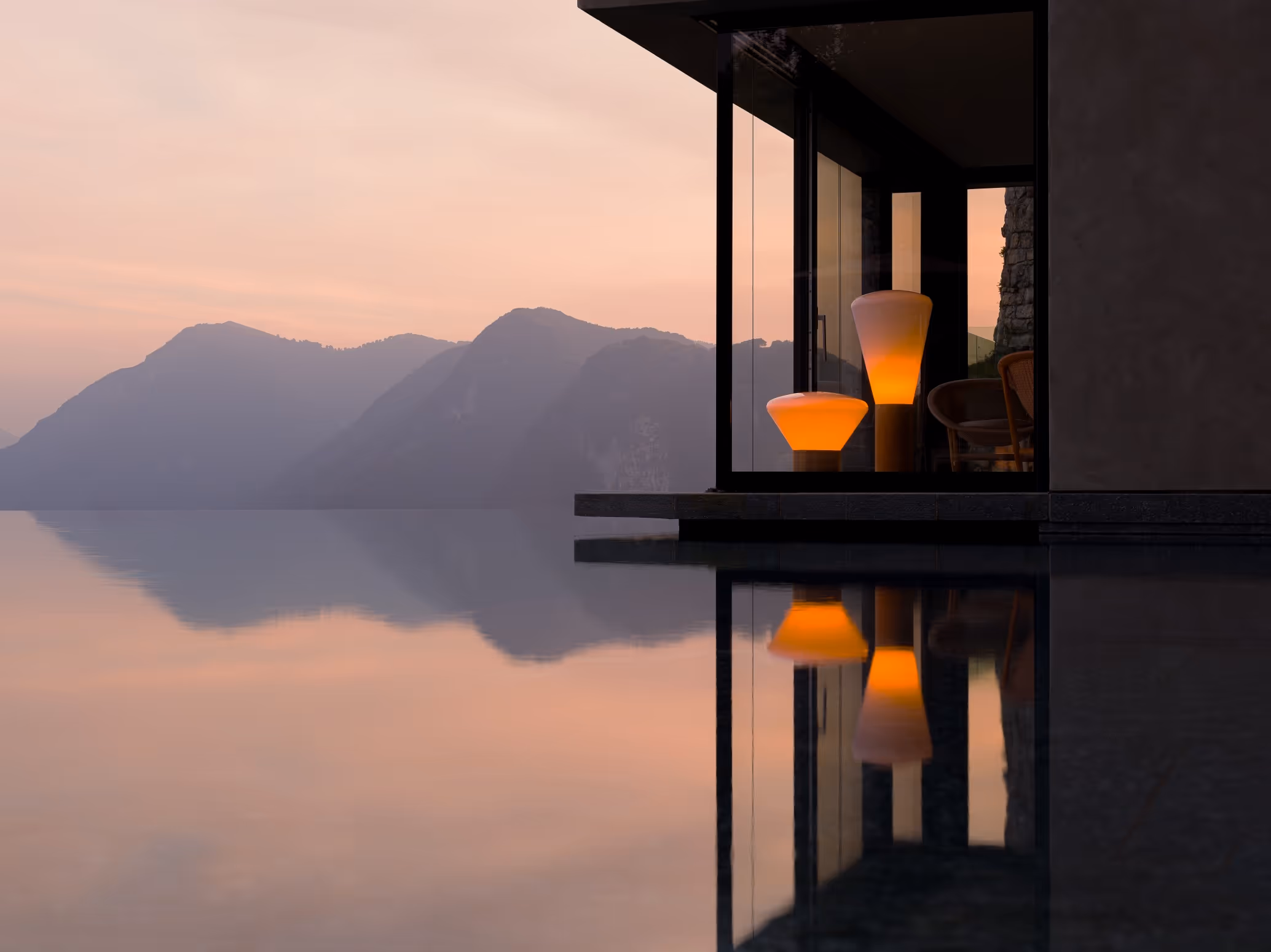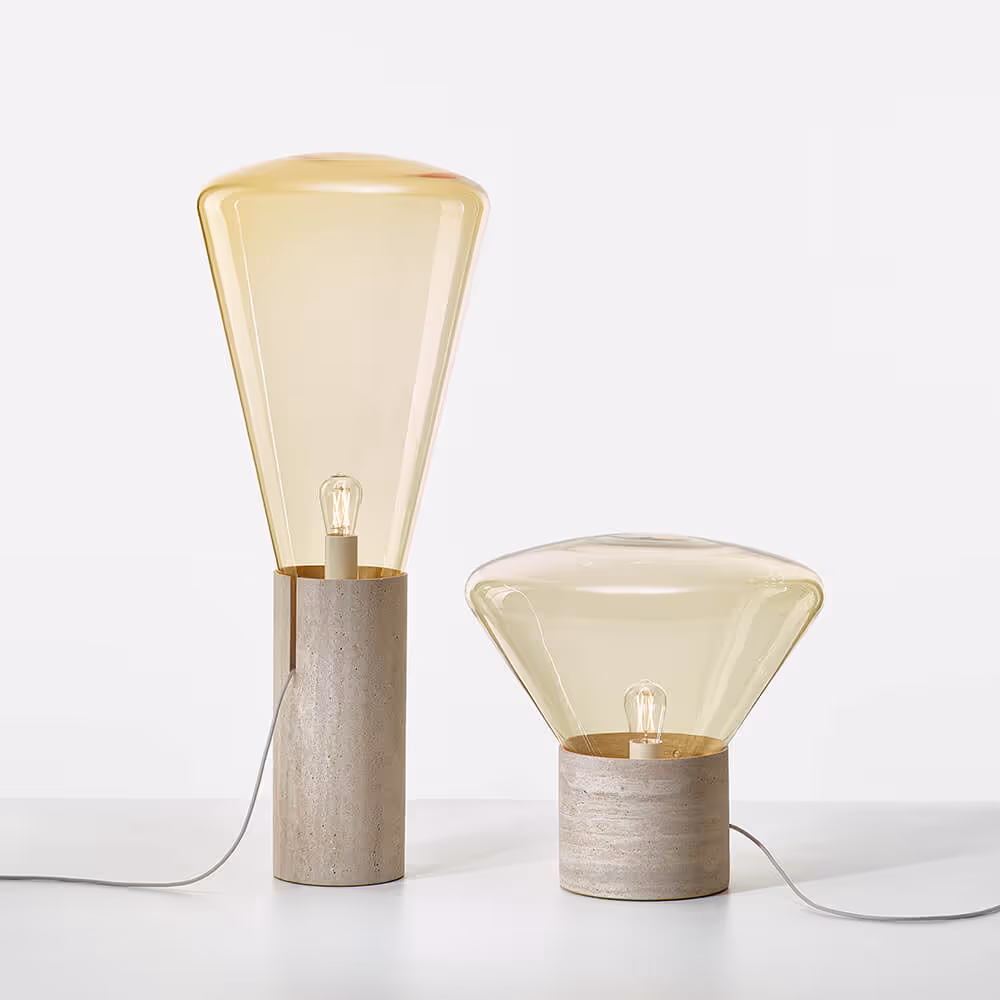 The Mona collection is based on the concept of penetrating forms. The light source boldly traverses the ample volume of smooth handblown glass to reveal the thrilling tension inherent in the design. The collection’s essence, however, lies in its unconventional construction and refined combination of materials.
