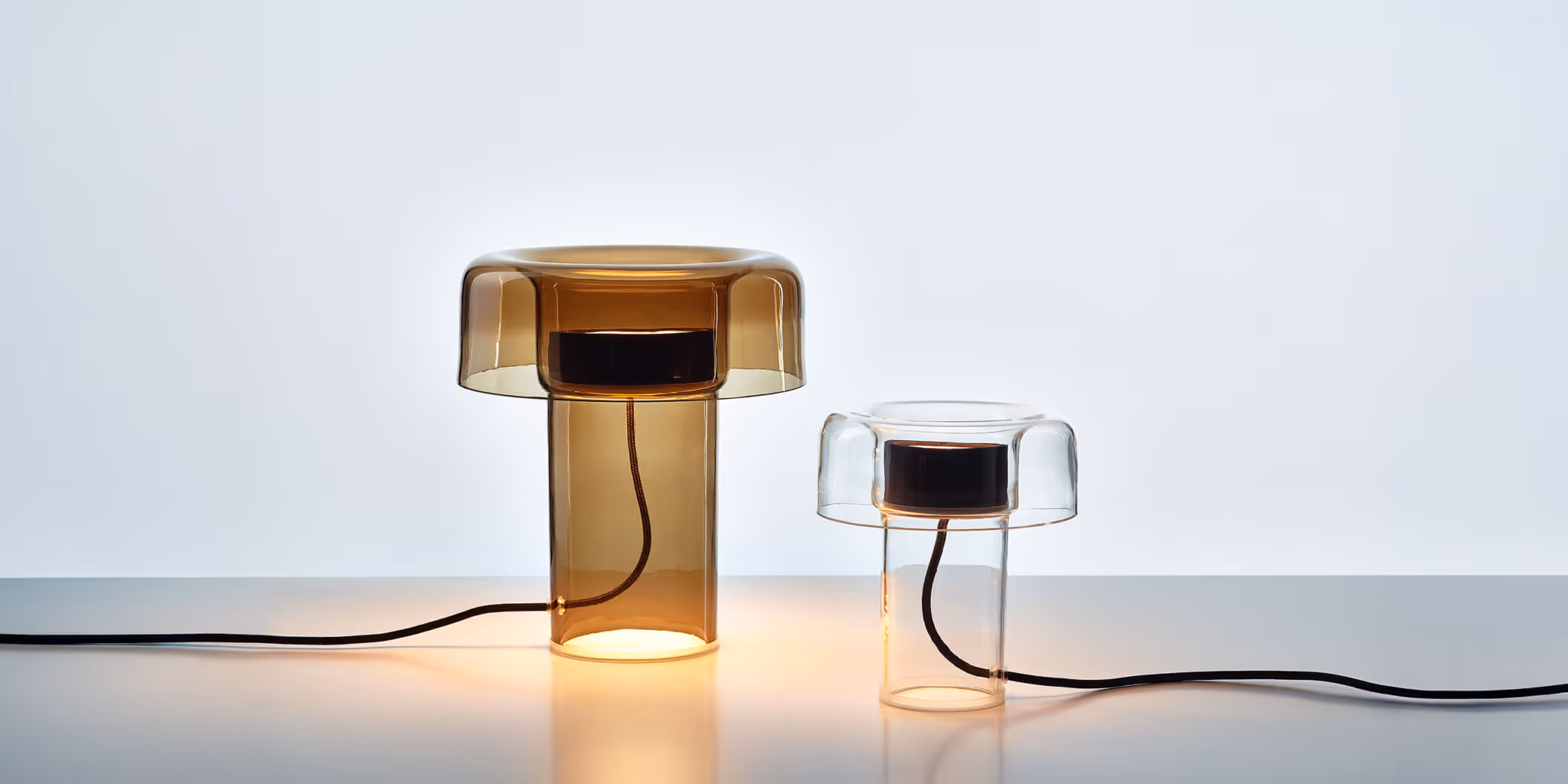 The outline of the light resembles the classic typology of a table lamp, which has always been a companion to humans during evening sessions. The archetypal silhouette in a purity-of-form concept has an opening with a double-sided light source in an aluminium fixture. The flat source casts its light gently in two directions, upwards and downwards into the glass base, creating intimate atmospheric effects. The two sizes are available in transparent, brown, smoke grey, olive green, or opaline glass. The intensity of the experience can be modulated thanks to an integrated dimmer.
