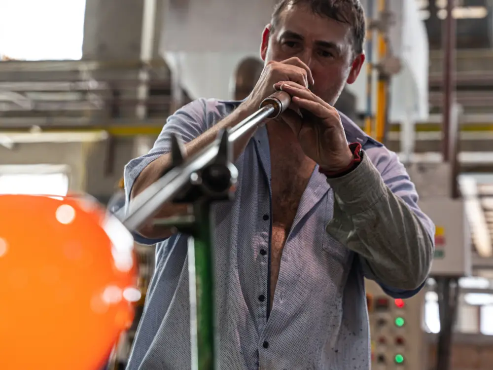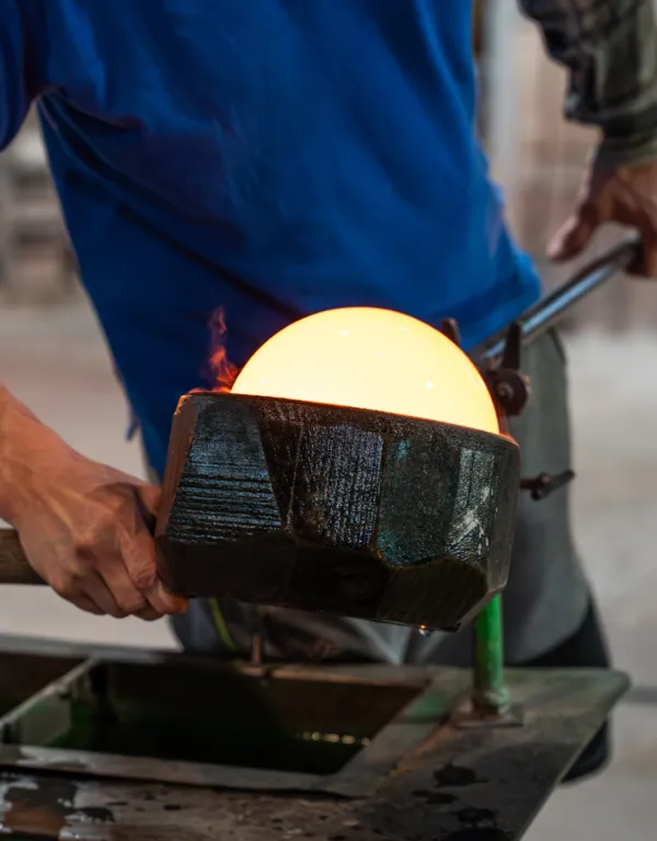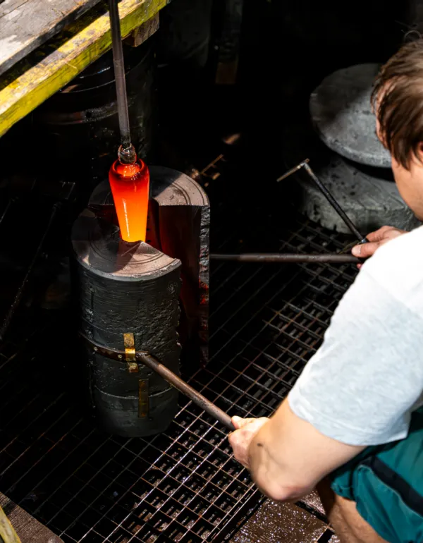 We offer custom manufacturing of handblown glass based on your own designs. Our modern glassworks, with its long-standing tradition, experienced team of master glassmakers, and extensive capacity, regularly fulfils commissions for designers, artists, students, and other glass companies seeking reliable production support.