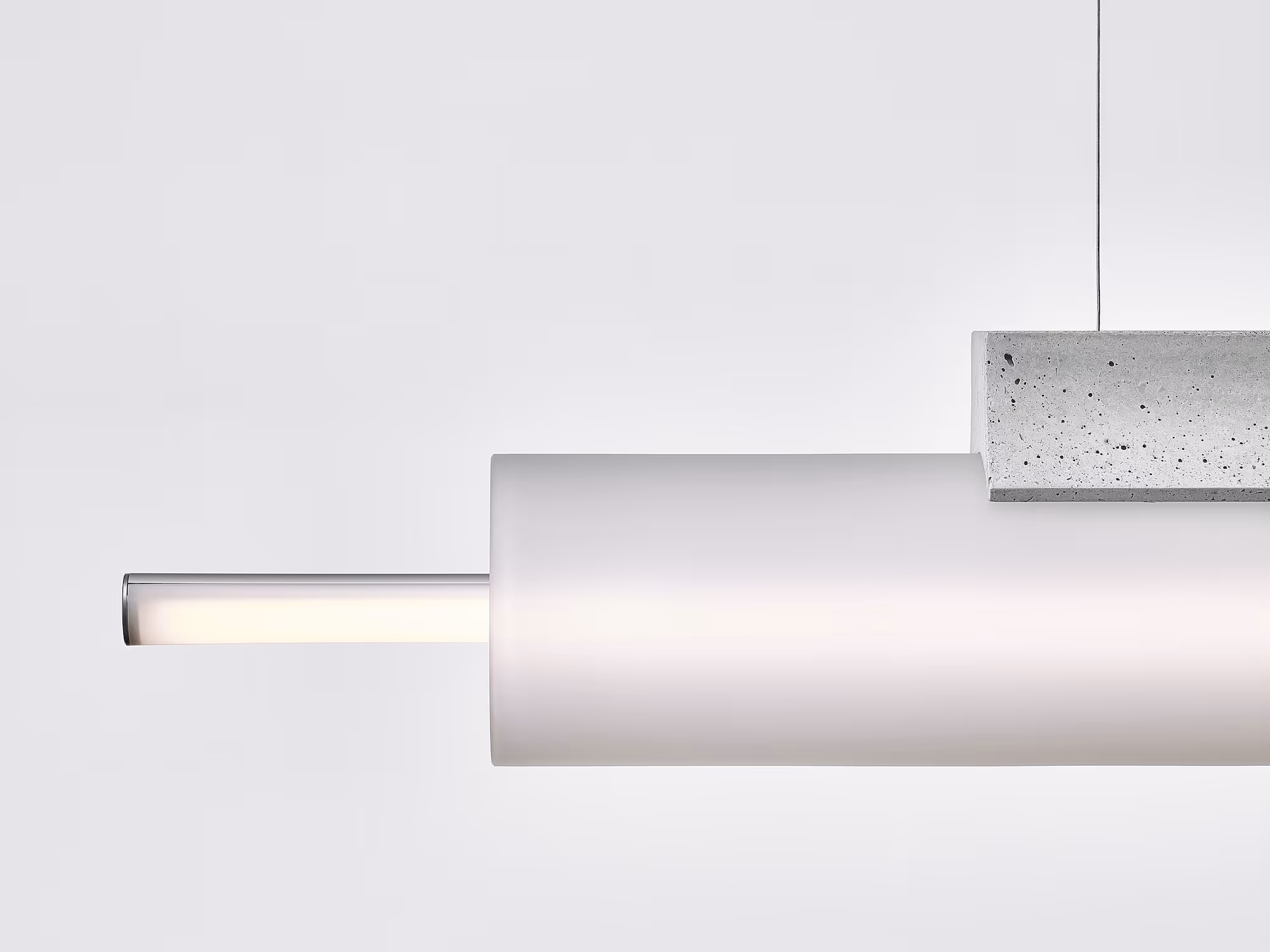 The Overlay collection stands out for its combination of handblown glass and architecturally inspired concrete elements.