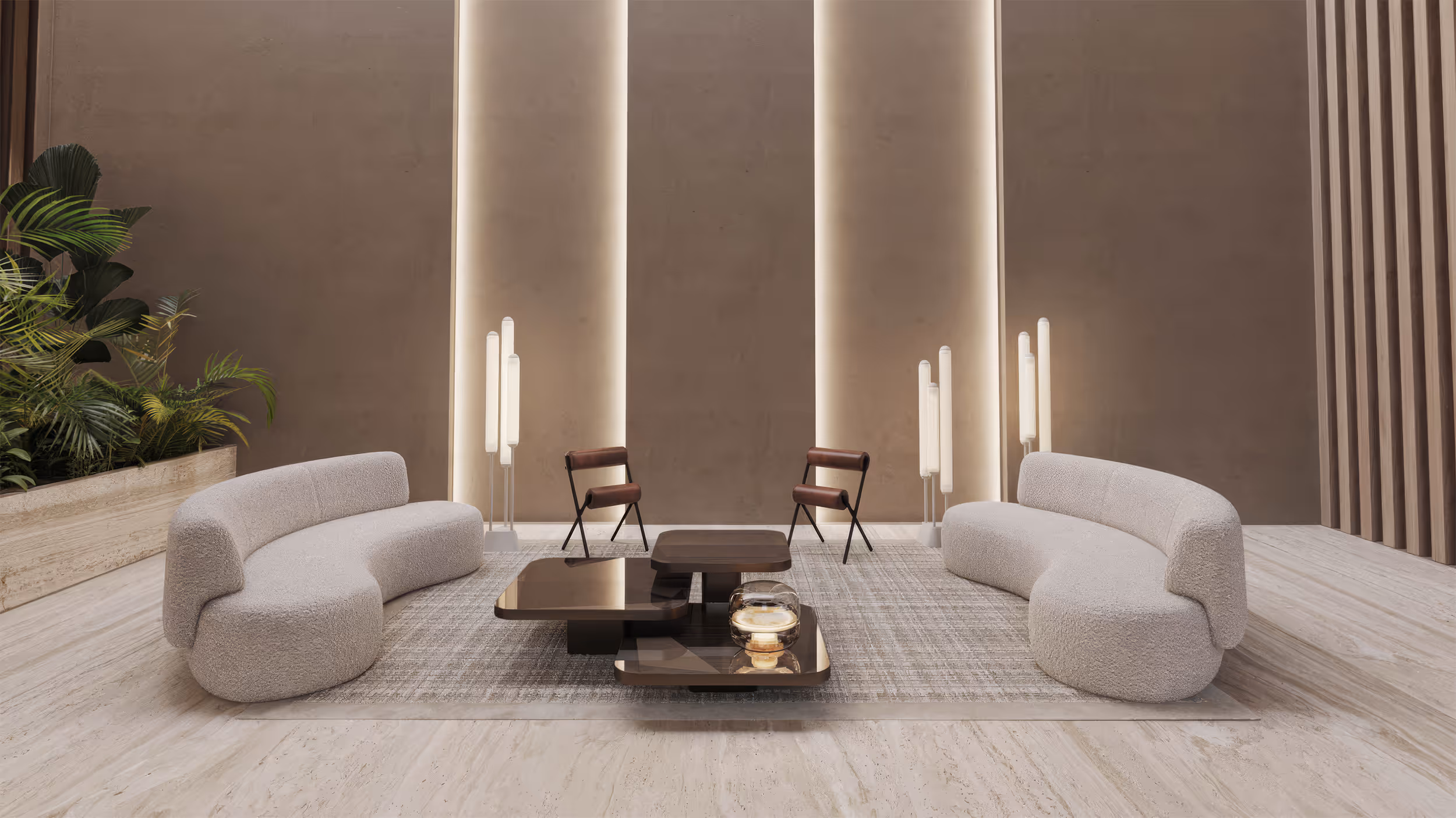 Across BROKIS collections, glass can be naturally complemented by white powder coating, chrome, light travertine, or onyx, connecting light seamlessly with interior architecture.