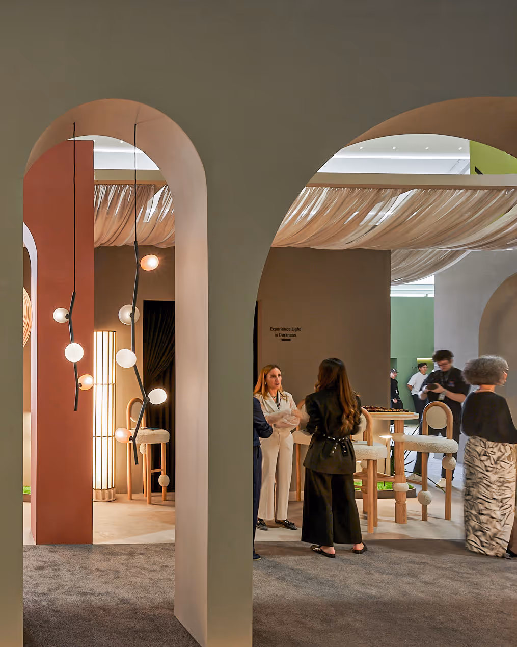 The stand, inspired by the concept of a “Pavilion of Light,” offered visitors a curated journey through a gallery-like space that gradually transitioned from a soft, luminous atmosphere into a dramatic dark room. Here, guests experienced a captivating interplay of light and sound brought to life through selected BROKIS lighting collections.